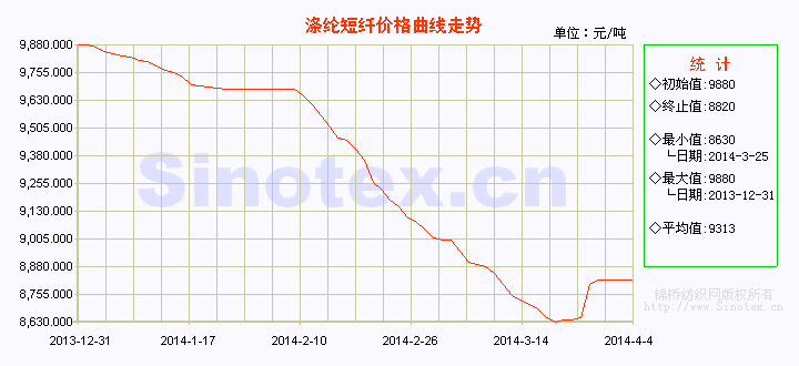 【錦橋紡織網(wǎng)專(zhuān)稿】4月份的第一周(3.29-4.4),滌綸短纖擴(kuò)幅續(xù)漲,整體成交明顯縮量。滌綸短纖價(jià)格在前2日小幅補(bǔ)漲后維持整理格局,報(bào)價(jià)平穩(wěn)。上游原油價(jià)格回調(diào),PX、PTA期貨大幅回落,聚酯大盤(pán)重歸平靜,滌綸短纖原料支撐趨弱;下游在上周多已補(bǔ)貨,且又臨近清明假期,心態(tài)觀(guān)望,消耗前期庫(kù)存為主。滌綸短纖因而僵持整理,成交持續(xù)清淡。預(yù)計(jì)下周滌綸短纖穩(wěn)中偏弱可能性較大。后市須密切關(guān)注原料走勢(shì)。4月4日,1.4Dx38mm滌綸短纖價(jià)格運(yùn)行在8820元/噸(比當(dāng)日國(guó)內(nèi)3128B級(jí)棉花現(xiàn)貨價(jià)格低10165元/噸,價(jià)差縮小),本周累計(jì)擴(kuò)幅續(xù)漲100元/噸,跌幅1.15%。