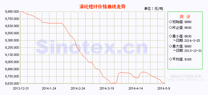 【錦橋紡織網(wǎng)專稿】5月份以來(lái),滌綸短纖繼續(xù)向低位行進(jìn),價(jià)格累計(jì)擴(kuò)幅續(xù)跌。聚酯大盤(pán)整體氣氛疲軟,滌短原料原料PTA、MEG、聚酯切片等繼續(xù)弱勢(shì)下滑,支撐不足。雖然下游滌短庫(kù)存偏低,存在剛性補(bǔ)貨需求,但市場(chǎng)“買(mǎi)漲不買(mǎi)跌”,小單補(bǔ)貨為主。滌短市場(chǎng)氣氛萎靡,報(bào)價(jià)小幅下跌,廠家優(yōu)惠走貨為主,成交重心走低。上下游缺乏利好刺激,預(yù)計(jì)短期內(nèi)滌短偏弱運(yùn)行為主,后市須密切關(guān)注原料走勢(shì)。5月9日,1.4D×38mm滌綸短纖市場(chǎng)價(jià)格運(yùn)行在8640元/噸(比當(dāng)日國(guó)內(nèi)3128B級(jí)棉花現(xiàn)貨價(jià)格低8832元/噸,價(jià)差繼續(xù)縮?。?,本周價(jià)格累計(jì)下跌110元/噸,跌幅1.26%。