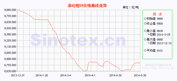 中石化5月聚酯切片合同結(jié)算價為:半光切片8300元/噸,有光、工業(yè)絲切片8100元/噸,全消光切片9100元/噸。6月半光切片預(yù)收價為8700元/噸。中石化5月滌短結(jié)算價為:1.4D半光滌短9200,1.2D有光滌短9700,較4月跌50元。