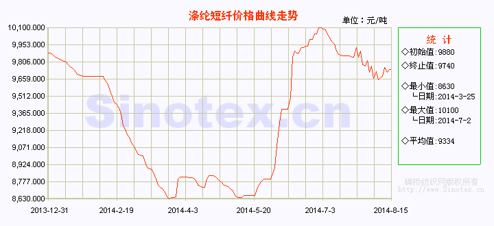 【錦橋紡織網(wǎng)專稿】8月第二周(8.11-8.15),滌綸短纖行情先漲后穩(wěn),價格累計止跌小幅反彈。11日(周一),受PTA期貨漲勢較好提振,部分滌綸短纖廠家試探性上調(diào)報價,市場交投氣氛有所改善,下游多有補貨舉動,滌綸短纖整體成交量短暫爆發(fā)。其中,南方市場表現(xiàn)依舊優(yōu)于北方,滌綸短纖廠家產(chǎn)銷多超百,主流250-350%,少數(shù)低于200%。周二市場恢復平靜。13日(周三)滌綸短纖行業(yè)聯(lián)誼會限產(chǎn)保價倡導下,雖江浙滌綸短纖廠家報價普漲至萬元上下出廠,但下半周滌綸短纖重心僅小幅抬升50-100元/噸,高價成交受阻。因終端疲弱,市場整體信心依然不足,拖累了采購積極性,下游仍維持按需采購節(jié)奏,滌綸短纖廠家主流產(chǎn)銷普遍回落在6-8成。8月15日,1.4D×38mm滌綸短纖市場價格運行在9740元/噸(比當日國內(nèi)3128B級棉花現(xiàn)貨價格低7381元/噸,價差縮?。?,本周價格累計上漲85元/噸,漲幅0.88%,價格仍運行在10000元/噸的整數(shù)位之下。
