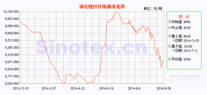【錦橋紡織網(wǎng)專稿】2014年9月第4周,滌綸短纖行情跌勢有所放緩。前兩日在期貨跌勢帶動下,滌綸短纖延續(xù)下行走勢。江浙及福建地區(qū)成交重心都失守9000元/噸整數(shù)關(guān),心態(tài)悲觀。下游維持小單剛需補貨,成交零散。后三日,滌綸短纖價格跌勢放緩,行情僵持平穩(wěn)。受24日PX大幅反彈影響及滌綸短纖結(jié)算價出臺支撐,25日PTA期貨上漲超百點,聚酯大盤整體成交氣氛回暖,滌綸短纖下游補貨意愿增強,交投增多,成交明顯放量。26日雖報價多有上漲,但實際成交跟進有阻力。周末,江浙1.4D直紡滌綸短纖主流價在8900-9000元/噸出廠,較上周下跌逾百元。目前,上游原料呈僵持盤整狀態(tài),各產(chǎn)品結(jié)算價已出臺,下游聚酯市場節(jié)前備貨成交有所好轉(zhuǎn),而下周面臨國慶小長假,滌綸短纖有望呈現(xiàn)弱穩(wěn)行情。