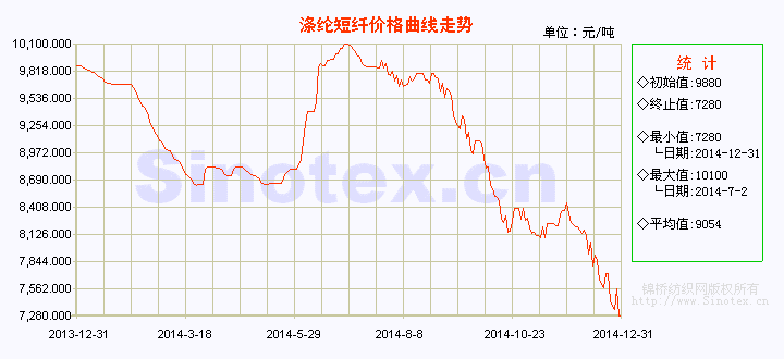 【錦橋紡織網專稿】2014年,滌綸短纖行情主要跟隨上游原料走勢而變化,而下游純滌及其混紡紗、布市場始終疲弱不振,對滌綸短纖行情拉動力不足,以至形成拖累。下上半年滌綸短纖價格走勢先跌后漲,下半年價格跌跌不休,創(chuàng)下5年低位。全年統(tǒng)計:1.4D直紡滌綸短纖市場均價由年初的9880元/噸下跌至年末的7280元/噸,累計下跌2600元/噸,跌幅26.32%。以下具體劃分為四個階段來簡要分析。