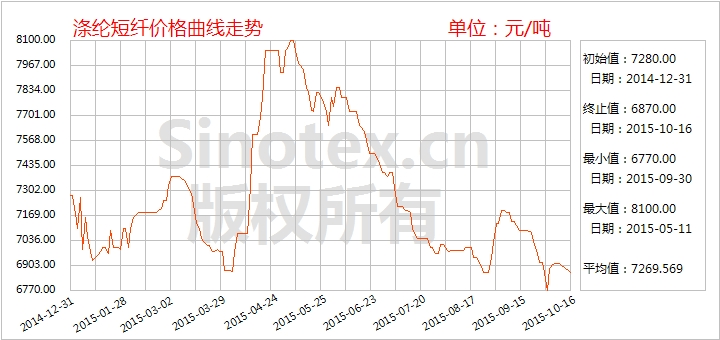 【錦橋紡織網(wǎng)專稿】2015年10月以來,滌綸短纖價格先揚后抑。上旬止跌小幅反彈150元/噸,進(jìn)入中旬調(diào)整回落50元/噸。國慶期間,油價大漲,聚酯大盤穩(wěn)中略上,滌綸短纖報價及交投氣氛均有回升。節(jié)后的10月7-10日滌綸短纖報價重心上調(diào)100-150元/噸,江浙1.4D直紡滌綸短纖主流報6950-7100元/噸出廠。上旬開工負(fù)荷在59.7%,主流廠家?guī)齑?7-22天附近,滌綸短纖現(xiàn)金流100元/噸上下。而需求面仍沒有大的改善,紡企堅持隨用隨買,廠家內(nèi)心多數(shù)悲觀,順價出貨為主,市場表現(xiàn)平穩(wěn)。進(jìn)入中旬,隨著國際油價及上游原料亞洲PX、國內(nèi)MEG、PTA價格回落調(diào)整,聚酯大盤走勢偏弱,滌綸短纖漲勢失去支撐,廠家報價多有下調(diào),市場觀望氣氛較濃,江浙1.4D直紡滌綸短纖主流報6900-7000元/噸出廠。原料成本堅挺,滌綸短纖現(xiàn)金流萎縮明顯。滌綸短纖后期行情變動或更多依賴于油價及PTA等上游情況,需予以關(guān)注。