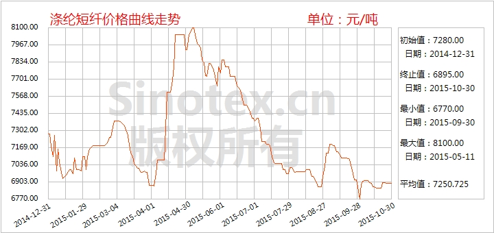 【錦橋紡織網專稿】2015年10月滌綸短纖價格小幅反彈后穩(wěn)中弱勢調整。上旬滌綸短纖價格止跌小幅反彈150元至6915元/噸,進入中下旬調整回落25元至6895元/噸。國慶期間,油價大漲,聚酯大盤穩(wěn)中略上,滌綸短纖報價及交投氣氛均有回升。節(jié)后的10月7-10日滌綸短纖報價重心上調100-150元,江浙1.4D直紡滌綸短纖主流報價至6950-7100元/噸出廠。上旬滌綸短纖廠家開工負荷在59.7%,主流廠家?guī)齑嬖?7-22天附近,滌綸短纖現(xiàn)金流100元上下。然而需求面仍沒有大的改善,紡企堅持隨用隨買,廠家內心多數悲觀,順價出貨為主,市場表現(xiàn)平穩(wěn)。進入中下旬,隨著國際油價持續(xù)走低及上游原料亞洲PX、國內MEG、PTA價格回落調整,聚酯大盤走勢偏弱,下游需求始終未見起色,滌綸短纖漲勢失去支撐,廠家報價以維穩(wěn)為主,略有下調,市場觀望氣氛較濃,商家后市預期多偏謹慎。