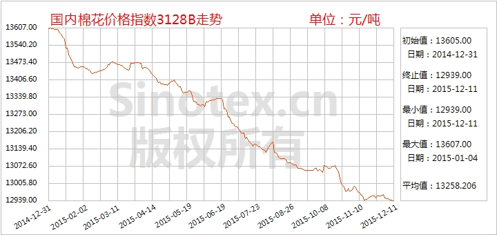 12月11日統(tǒng)計,中國棉花價格指數(shù)CCindex3128B累計下跌20元至12939元/噸;價格比電子撮合1601合約高1080元/噸、比鄭棉期貨1601合約高1014元/噸。(參見:表一)