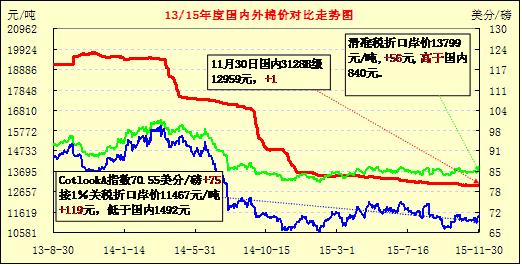 近月以來,保稅區(qū)“出庫多,入庫少,保稅庫空置大”的趨勢明顯。外棉的價格優(yōu)勢逐漸降低,需求減少使港口保稅區(qū)棉花庫存持續(xù)減少,中國各主港保稅棉庫存從22-23萬噸降至15萬噸左右。紡企所剩余配額極少,配額價值進(jìn)一步提升。市場僅少量保稅、清關(guān)的印度棉有所成交,從東南亞轉(zhuǎn)港、印度國內(nèi)裝運(yùn)的2014/15年度陳棉以CCI拋儲競拍的棉花為主,等級、長度及其它指標(biāo)較好(1-5/32長度占比高),紡C40S、C50S紗易于配棉,而且13500-13600元/噸的凈重提貨價基本與新疆棉2128B(2129B)一致,低于SM1-5/32級美棉近1000元/噸。而港口部分高等級美棉、澳棉等因性價比不高銷售滯緩。11月29日青島港SM1-5/32澳棉、C/ASM1-5/32清關(guān)后人民幣報價分別為15800-16000元/噸、14500-14700元/噸,均明顯高于疆棉2128、3128級價格,大量上市的高品質(zhì)新疆棉替代作用明顯。根據(jù)海關(guān)數(shù)據(jù)顯示,10月我國進(jìn)口棉花4.21萬噸,環(huán)比減17.29%;1-10月,我國累計進(jìn)口棉花120.23萬噸,減幅64.30%。