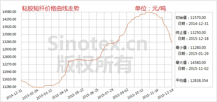 【錦橋紡織網(wǎng)專稿】上月,粘膠短纖長達8個月的上漲行情終結(jié),價格表現(xiàn)為小幅回落調(diào)整的態(tài)勢。但11月底和12月初,粘膠短纖數(shù)百噸低價(13800元/噸)訂單沖擊市場,引發(fā)下游恐慌心態(tài)升級,采購越發(fā)謹慎,行業(yè)庫存不斷上升;加之淡季下游紗廠自身訂單較弱,臨近年末回籠資金意愿偏強,采購原料操作意愿較弱;此外,近期烏鎮(zhèn)互聯(lián)網(wǎng)會議牽連周邊環(huán)保治理,造成終端銷路不暢;一系列利空云集,導致12月上中旬粘膠短纖市場價格如“決堤”般潰退,出現(xiàn)斷崖式下跌。截至12月20日,1.5Dx38mm粘膠短纖市場均價累計下跌1000元至13250元/噸,跌幅7.02%,價格高于當日中國棉花價格指數(shù)CCindex328現(xiàn)貨價格334元/噸,棉粘價格持續(xù)倒掛,價差大幅縮小957元/噸。