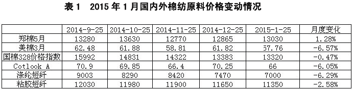 2015年1月,內(nèi)盤走勢強(qiáng)于外盤,內(nèi)盤維持震蕩,美盤則創(chuàng)出新低。國內(nèi)現(xiàn)貨也較穩(wěn)定,整體呈緩慢下行格局,國際現(xiàn)貨跌幅較大。同時,受原油暴跌影響,滌綸短纖和粘膠價格持續(xù)下跌,與棉花的價差再次拉大。