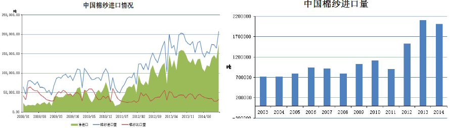 海關(guān)公布的數(shù)據(jù)顯示,2014年12月我國進(jìn)口棉紗20.6萬噸,環(huán)比增加25.7%,同比增加19.4%。2014年全年進(jìn)口棉紗201.1萬噸,同比下降4.2%。