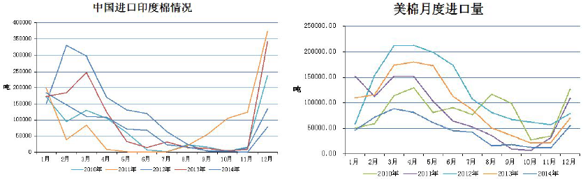 海關(guān)公布的數(shù)據(jù)顯示,2014年12月我國進(jìn)口棉花26.45萬噸,環(huán)比增加17.23萬噸,同比減少34.41萬噸;2014年9-12月,我國累計進(jìn)口棉花56.14萬噸,同比減少50.05%;2014年1-12月,我國累計進(jìn)口棉花243.94萬噸,同比減少41%。