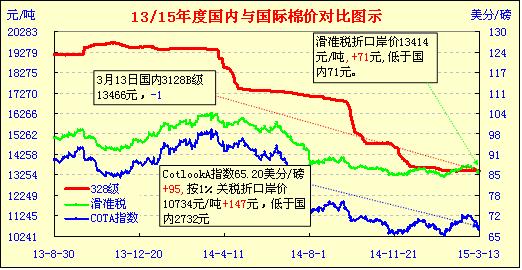 【錦橋紡織網(wǎng)專稿】2015年3月第2周,ICE期棉價格繼續(xù)回落,鄭棉期貨窄幅調(diào)整。國內(nèi)棉花現(xiàn)貨平穩(wěn)偏弱,市場購銷難以“升溫”。缺乏消費支撐,前期抬漲價格部分回落,優(yōu)質(zhì)棉價格依然堅挺。棉紗布價格平穩(wěn)偏弱,散單交易為主,大單稀少,紡企庫存偏高。