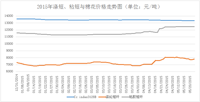 周末統(tǒng)計(jì),1.4D直紡滌綸短纖價(jià)格累計(jì)小幅下跌125元/噸,跌幅1.57%,周末價(jià)格運(yùn)行在7825元/噸,仍在8000元/噸整數(shù)位之下(見(jiàn)表一),比同期國(guó)內(nèi)3128B級(jí)棉花現(xiàn)貨價(jià)格指數(shù)低5540元/噸,價(jià)差較上周擴(kuò)大134元/噸。