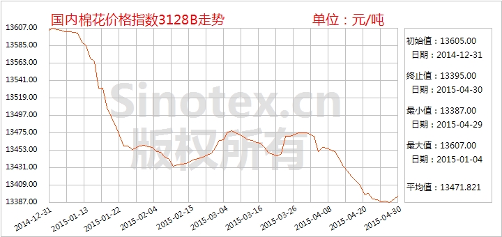 4月統(tǒng)計(jì),中國棉花價(jià)格指數(shù)CCindex3128B累計(jì)下跌80元/噸,月末價(jià)位在13395元/噸;價(jià)格比電子撮合1505合約高854元/噸、比鄭棉期貨1507合約高210元/噸,價(jià)差大幅縮小。(參見:表一)