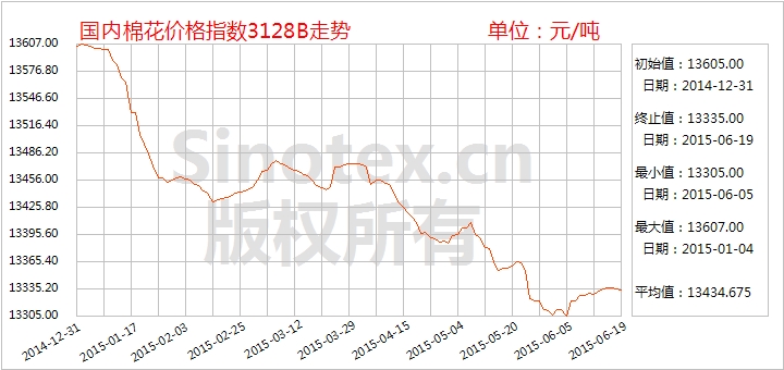 【錦橋紡織網(wǎng)專稿】2015年6月第3周,ICE期棉和鄭棉期貨均維持弱勢調(diào)整,棉花現(xiàn)貨市場價格表現(xiàn)仍然分化,中高等級小幅上調(diào),低等級繼續(xù)小降。下游紗布市場呈現(xiàn)淡季局面,價格下滑,紡織企業(yè)訂單減少,庫存增加,染廠開機率下降;港口棉花、棉紗庫存高位,貿(mào)易商銷售壓力較大。