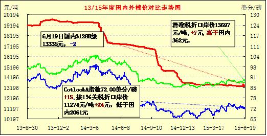 國內(nèi)儲備棉輪出政策初步明朗,市場空頭氣氛濃郁。棉花企業(yè)面臨還貸及拋儲壓力,加緊出貨。高等級棉花價格在期貨止跌之下小幅上調(diào),低等級棉價銷售疲軟價格維持跌勢。下游紡企開機率偏低,紗線價格持續(xù)走弱,紡企加工利潤萎縮,產(chǎn)品庫存增加抑制其對原料的需求。而且需求分散,規(guī)模紡紗企業(yè)進口棉、新疆棉需求集中,中小紡紗企業(yè)地產(chǎn)棉、落棉、低等棉為主。6月19日統(tǒng)計,中國棉花價格指數(shù)CCindex3128B累計上漲5元/噸,價位在13335元/噸;價格比電子撮合1507合約高1001元/噸、比鄭棉期貨1507合約高915元/噸,價差繼續(xù)擴大。(參見:表一)