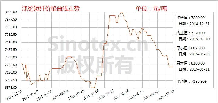 【錦橋紡織網(wǎng)專稿】2015年7月上旬,滌綸短纖價格短暫波動后繼續(xù)下跌走勢,累計跌幅接近200元/噸。月初在PTA裝置減產(chǎn)利好下,原料市場價格小幅反彈,支撐滌綸短纖止跌并出現(xiàn)向好跡象;然而,國際油價的暴跌行情使裝置檢修利好如曇花一現(xiàn),滌綸短纖原料價格大幅回落,微弱的支撐塌陷后,滌綸短纖回歸下跌走勢。7月10日統(tǒng)計,1.4D直紡滌綸短纖價格累計小幅下跌180元至7220元/噸,跌幅2.43%,仍運行在至8000元/噸整數(shù)位之下,比同期國內(nèi)3128B級棉花現(xiàn)貨價格指數(shù)低5983元/噸,價差較上周擴大167元/噸(見表一)