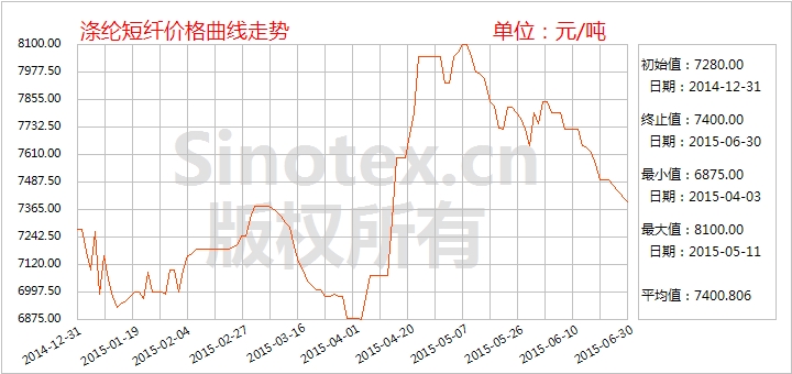 【錦橋紡織網(wǎng)專稿】2015年6月,滌綸短纖行情走勢(shì)先揚(yáng)后抑,價(jià)格累計(jì)收幅續(xù)降。月初,受上游原料裝置故障的助推短暫反彈200元/噸,江浙市場(chǎng)1.4D直紡滌綸短纖市場(chǎng)主流報(bào)至7850-7950元/噸出廠;隨后在聚酯大盤疲乏盤整和下游淡季行情拖累下持續(xù)走跌,價(jià)格累計(jì)下降450元/噸。月末,江浙市場(chǎng)1.4D直紡滌綸短纖市場(chǎng)主流報(bào)7450-7550元/噸出廠。6月30日統(tǒng)計(jì),1.4D直紡滌綸短纖價(jià)格累計(jì)小幅下跌250元/噸,跌幅3.27%,月末價(jià)格7400元/噸,仍運(yùn)行在8000元/噸整數(shù)位之下(見(jiàn)表一),比同期國(guó)內(nèi)3128B級(jí)棉花現(xiàn)貨價(jià)格指數(shù)低5863元/噸,價(jià)差較上月擴(kuò)大1200元/噸。2015年1-6月,1.4D直紡滌綸短纖價(jià)格累計(jì)上漲100元/噸,漲幅1.37%。