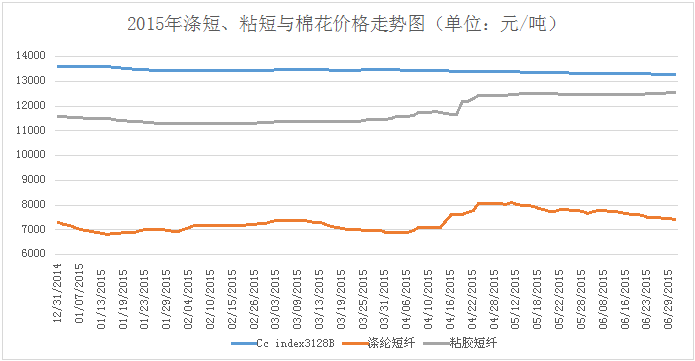 月初,滌綸短纖短暫小幅反彈。受5月底日本JX鹿島煉油裝置著火及逸盛海南工廠PTA裝置因機(jī)械故障這兩件突發(fā)事件的推動(dòng),滌綸短纖及其上游原料市場(chǎng)價(jià)格在5月底和6月初止跌小幅反彈。下游經(jīng)過(guò)5月30日和6月3日兩日集中補(bǔ)貨后,采購(gòu)回歸零星剛需。此后至月底,聚酯大盤疲乏整理,使得滌綸短纖繼續(xù)漲價(jià)阻力較大;而淡季之下紗、布行情清淡,貿(mào)易商及下游紗廠采購(gòu)意向淡薄,消耗前期備貨為主;滌綸短纖價(jià)格難獲支撐,轉(zhuǎn)入弱勢(shì)回調(diào)的走勢(shì)。滌綸短纖市場(chǎng)成交持續(xù)慘淡,廠商信心普遍不足。滌綸短纖廠家產(chǎn)銷難做平,維持6-8成附近,開(kāi)工負(fù)荷約66%,主流廠家?guī)齑?6-21天附近,部分稍低。滌綸短纖現(xiàn)金流較長(zhǎng)時(shí)間處于虧損狀態(tài),且市場(chǎng)預(yù)期7月偏空主導(dǎo),廠家出貨意向?yàn)橹?,減產(chǎn)現(xiàn)象增多,后期或延續(xù)陰跌下滑,繼續(xù)關(guān)注原油,PTA期貨走勢(shì)及聚酯、下游紗廠裝置檢修情況。2015年滌綸短纖、粘膠短纖和棉花價(jià)格走勢(shì)圖如下:
