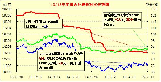 7月17日統(tǒng)計(jì),中國棉花價(jià)格指數(shù)CCindex3128B累計(jì)下跌28元/噸(-0.21%)至13175元/噸;價(jià)格比電子撮合1508合約高818元/噸、比鄭棉期貨1509合約高695元/噸,價(jià)差均較上周擴(kuò)大。(參見:表一)