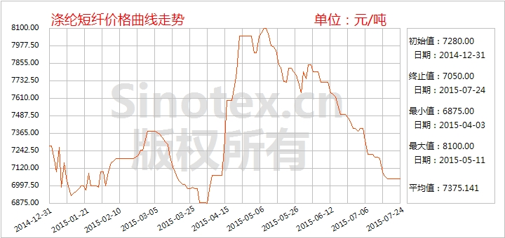 2015年7月中石化滌綸短纖結(jié)算價(jià):1.4D半光滌綸短纖7400元/噸;1.2D有光滌綸短纖8050元/噸,較上月降500元/噸。