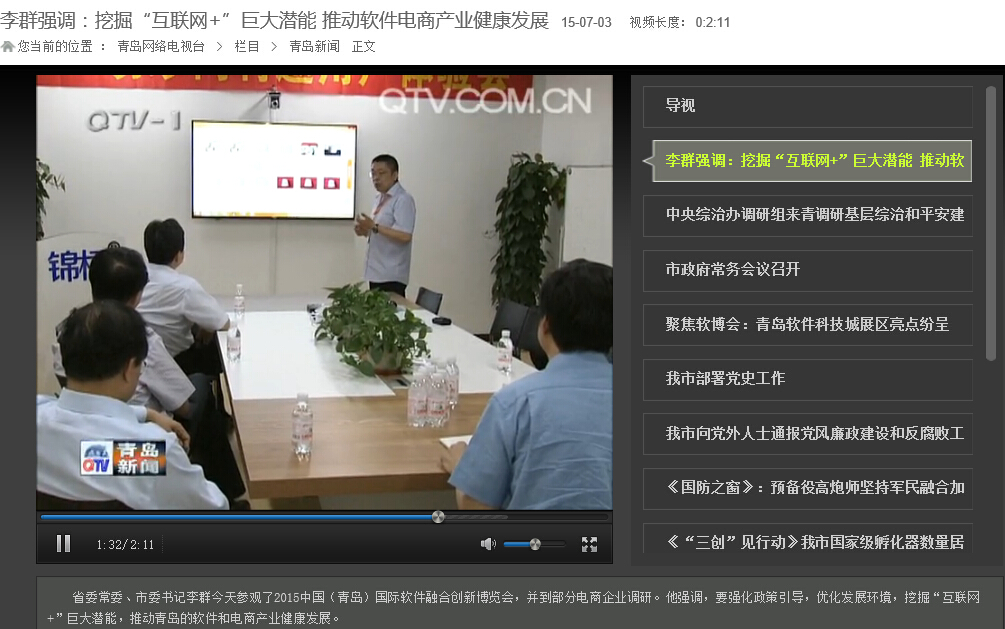 青島電視臺QTV-1《青島新聞》報道:李群強(qiáng)調(diào):挖掘“互聯(lián)網(wǎng)+”巨大潛能 推動軟件電商產(chǎn)業(yè)健康發(fā)展