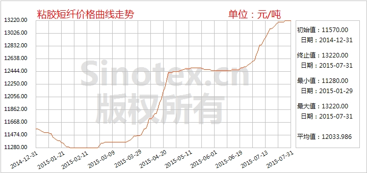 【錦橋紡織網(wǎng)專稿】2015年7月,粘膠短纖價格延續(xù)6月下旬的上漲走勢,大幅上行。其中上中旬漲勢迅猛,下旬漲勢趨緩。全月統(tǒng)計:1.5Dx38mm粘膠短纖均價累計上漲660元,漲幅5.25%,月末運行在13220元/噸,價格已高于同期中國棉花價格指數(shù)CCindex328(現(xiàn)貨價格)82元/噸。月末,中端報價13300-13500元/噸,實際成交13200-13300元/噸;高端報價13600元/噸,成交重心維持13500-13600元/噸。據(jù)相關(guān)分析,進(jìn)入7月,粘膠短纖售價已整體脫離2季度來的12000-12500元每噸行業(yè)盈虧線區(qū)間,實現(xiàn)盈利反轉(zhuǎn)。