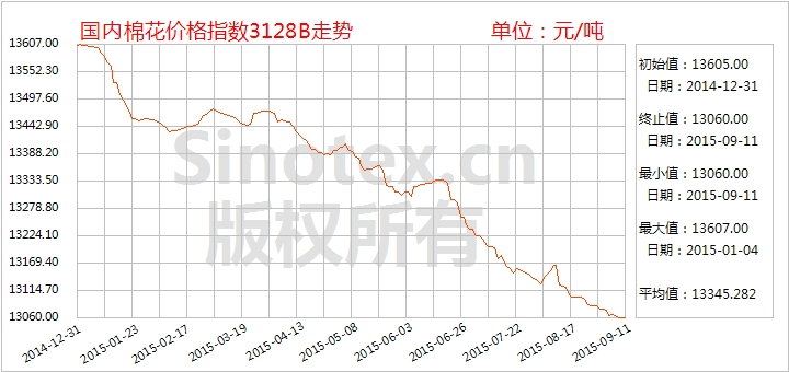 9月11日統(tǒng)計,中國棉花價格指數(shù)CCindex3128B累計下跌19元/噸,月末價位在13060元/噸;價格比電子撮合1510合約高892元/噸、比鄭棉期貨1511合約高645元/噸,價差大幅縮小。(參見:表一)