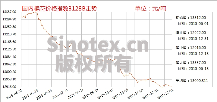 12月31日統(tǒng)計,中國棉花價格指數(shù)CCindex3128B累計下跌37元至12922元/噸;價格比電子撮合1601合約高1263元/噸、比鄭棉期貨1601合約高1017元/噸。(參見:表一)
