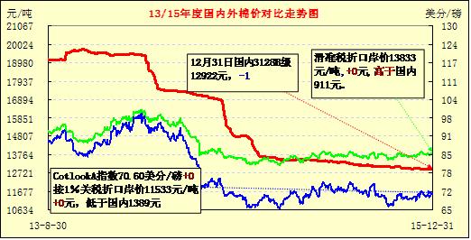 印度政府加大收儲力度、美國降雨或?qū)⒂绊懶旅拶|(zhì)量、國內(nèi)棉花供應(yīng)充足、年底配額已基本使用殆盡等綜合因素導(dǎo)致我國外棉市場成交繼續(xù)冷清,價格窄幅整理。中下旬以來,港口2015/16年度美棉未見蹤影(一些原定12月25日前抵港交貨的合同或延期或取消),印度新棉也寥寥可數(shù),目前入保稅庫的印度棉仍以印度棉花企業(yè)和出口商從CCI拋儲競賣盤面上接下的2014/15陳棉為主。據(jù)了解,S-61-5/32〞清關(guān)后人民幣報價13500-13700元/噸,港口詢價不多,出貨不快;S-61-1/8〞、S-61-3/32〞等低等級低品質(zhì)的棉花銷售冷清、遲滯。美棉SM1-1/8價格為14300-14500元/噸,印度13600-13700元/噸,澳棉SM1-5/32價格為15700-16000元/噸,西非、烏棉棉13200-13400元/噸。