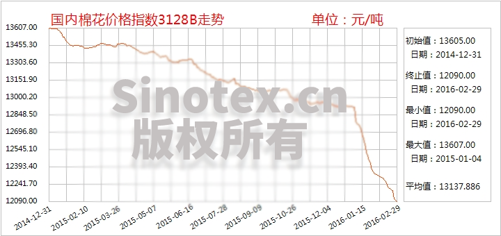自2016年1月份以來,國內(nèi)棉花現(xiàn)貨價格行情由微幅緩降的平穩(wěn)節(jié)奏轉(zhuǎn)入“急轉(zhuǎn)直下”的大跌模式。進入2月,雖然外棉期現(xiàn)貨及國內(nèi)電子盤都擴幅大跌,國內(nèi)棉花現(xiàn)貨價格亦跟跌,但受加工成本和新疆生產(chǎn)建設兵團挺價以及用棉企業(yè)采購原料過渡的支撐,現(xiàn)貨調(diào)整幅度明顯小于鄭期、商品棉電子撮合盤面,跌幅較1月份也有所收窄。全月統(tǒng)計,中國棉花價格指數(shù)CCindex3128B累計下跌258元至12090元/噸;價格比電子撮合1603合約高1269元/噸、比鄭棉期貨1603合約高1215元/噸。(參見:表一)對于目前形勢,有市場人士預計,棉花12000元/噸不是底部,現(xiàn)貨破10000元/噸的可能性也很大;也有觀點認為,目前棉花產(chǎn)業(yè)鏈正處于“鳳凰涅槃”的蛻變和重生階段,隨著原料成本大幅下降,棉紡企業(yè)有望扭虧為贏。
