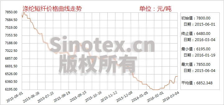自2月中旬以來(lái),國(guó)際油價(jià)觸底反彈,帶動(dòng)原料PX、PTA、MEG、聚酯切片和滌綸短纖市場(chǎng)一并步入觸底回升的通道。進(jìn)入3月份,紐約油價(jià)反彈至兩個(gè)月高點(diǎn),聚酯原料強(qiáng)勁上漲;而下游開工率回升后購(gòu)買力拉升。產(chǎn)業(yè)鏈整體呈現(xiàn)回暖氣象,滌綸短纖市場(chǎng)報(bào)價(jià)跟隨走高150元/噸以內(nèi),漲幅小于原料市場(chǎng),市場(chǎng)購(gòu)銷也未現(xiàn)火爆景象。3月1日,在期貨PTA漲停及3月ACP談判成功等利好助推下,滌短廠家報(bào)價(jià)紛紛上揚(yáng)50-100元/噸不等,江浙1.4D直紡滌短市場(chǎng)主流報(bào)6450-6550元/噸出廠。3日,報(bào)價(jià)繼續(xù)上漲50元/噸,江浙1.4D直紡滌短市場(chǎng)主流報(bào)6500-6600元/噸出廠。但下游追漲心態(tài)普遍謹(jǐn)慎,觀望氣氛為主。春節(jié)以來(lái)滌綸短纖市場(chǎng)價(jià)格累計(jì)上漲320元/噸,漲幅5.19%。目前,聚合原料成本呈走高趨勢(shì),下游織造處于傳統(tǒng)需求旺季,滌綸短纖市場(chǎng)有望維持漲勢(shì)。