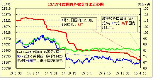 4月18日,代表進口棉中國主港到岸均價的中國進口棉價格指數(shù)FCIndexM累計上漲2.71美分/磅至69.4美分/磅(參見:表一)。按1%關(guān)稅和滑準稅計算,折人民幣價格分別為11580元/噸和13868元/噸,與當日中國棉花價格指數(shù)3128B棉相比,國內(nèi)棉價與進口棉的價差分別為421元/噸和-1867元/噸。CotlookA指數(shù)為67.85美分/磅,1%關(guān)稅下折人民幣11326元/噸,低于當日同等級中國棉花價格指數(shù)675元,見下圖: