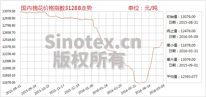 鄭棉高位回落。前期炒作資金從市場(chǎng)撤離使鄭棉大幅下挫,回歸基本面,重心下移趨勢(shì)明顯。截至5月9日,CF1607合約累計(jì)下跌330元至11940元/噸,跌幅2.69%。分析認(rèn)為在期貨高升水局面改觀之前,鄭棉仍有下滑空間,預(yù)計(jì)短期內(nèi)將是震蕩偏弱走勢(shì)。