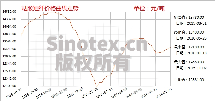 【錦橋紡織網(wǎng)專稿】粘膠短纖市場(chǎng)價(jià)格經(jīng)過(guò)4月中下旬短暫的高位回落調(diào)整后,5月份再度步入上升通道,但與2016年一季度相比,此波漲勢(shì)較緩。截至5月26日,1.5Dx38mm粘膠短纖市場(chǎng)均價(jià)累計(jì)上漲150元至13420元/噸;1.2Dx38mm粘膠短纖市場(chǎng)均價(jià)累計(jì)上漲160元至13860元/噸。