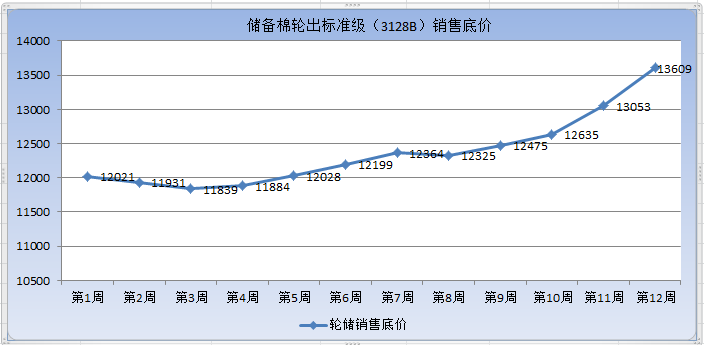 銷售底價(jià)漲幅擴(kuò)大。儲(chǔ)備棉輪出第11、12周(7.4-7.22)輪出銷售底價(jià)(標(biāo)準(zhǔn)級(jí)價(jià)格)分別為13053元/噸、13609元/噸。銷售底價(jià)兩周累計(jì)上調(diào)974元/噸,漲幅7.71%。