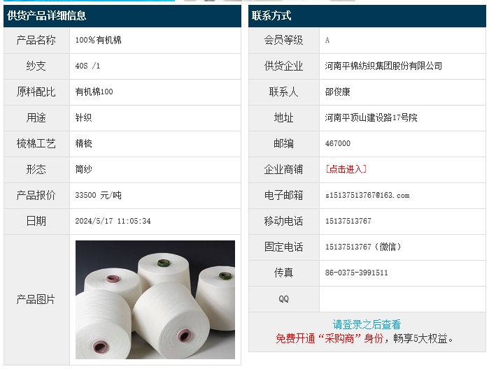 5月17日,河南平棉紡織集團股份有限公司針織用精梳有機棉100 40S,報價為33500元/噸,實際成交價以協(xié)商為準。[點擊查看詳情]