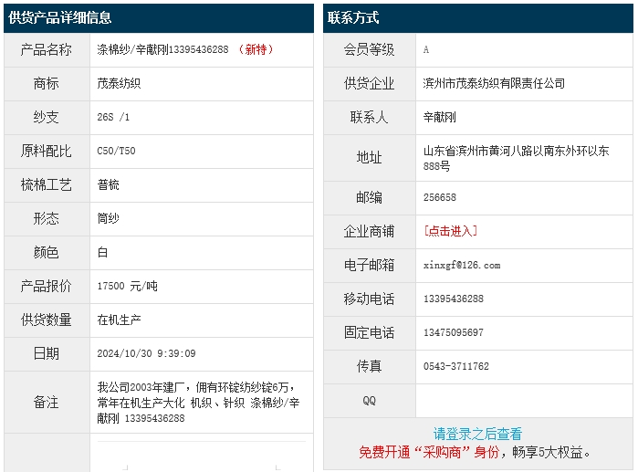 10月30日,濱州茂泰紡織有限責(zé)任公司滌棉紗C50/T50 26S,報(bào)價(jià)為17500元/噸,實(shí)際成交價(jià)以協(xié)商為準(zhǔn)。[點(diǎn)擊查看詳情]