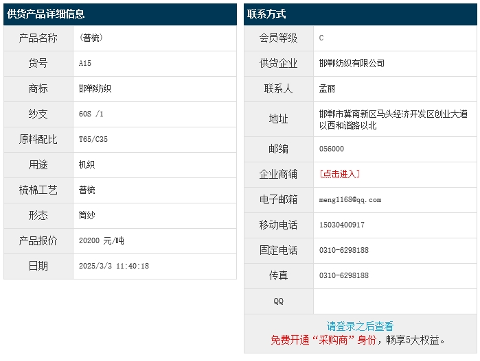 3月3日,邯鄲紡織有限公司機(jī)織滌棉紗T65/C35 60S,報價為20200元/噸,實(shí)際成交價以協(xié)商為準(zhǔn)。[點(diǎn)擊查看詳情]