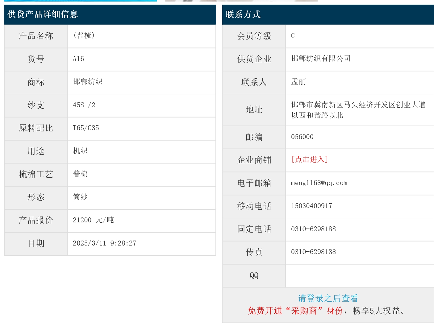 3月11日,邯鄲紡織有限公司機織滌棉紗T65/C35 45S/2,報價為21200元/噸,實際成交價以協(xié)商為準。[點擊查看詳情]