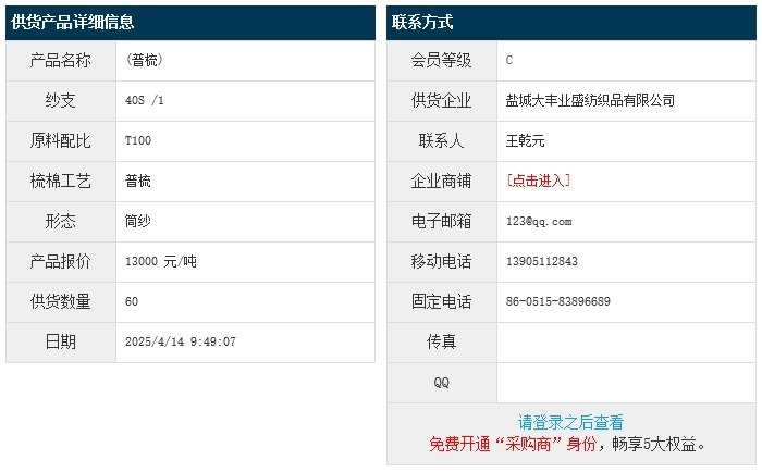 4月14日,鹽城大豐業(yè)盛紡織品有限公司純滌紗T100 40S,報價為13000元/噸,實際成交價以協(xié)商為準(zhǔn)。[點擊查看詳情]