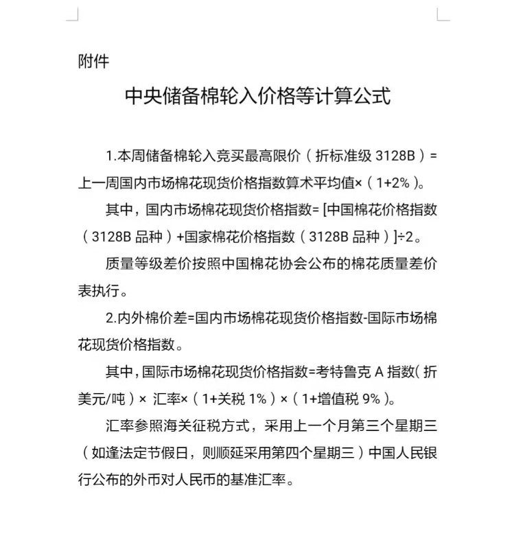 輪入競買最高限價(到庫價格)隨行就市動態(tài)確定,原則上與國內(nèi)棉花現(xiàn)貨價格掛鉤聯(lián)動并上浮一定比例,每周調(diào)整一次。輪入期間,當(dāng)內(nèi)外棉價差連續(xù)3個工作日超過800元/噸時,暫停交易;當(dāng)內(nèi)外棉價差回落到800元/噸以內(nèi)時,重新啟動交易。由中儲糧集團公司會同全國棉花交易市場統(tǒng)一公布輪入競買最高限價和內(nèi)外棉價差數(shù)據(jù)。(具體計算公式見附件)