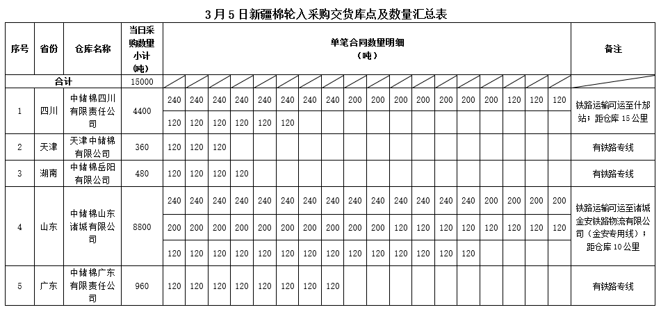 中國(guó)儲(chǔ)備棉管理有限公司定于2020年3月5日采購(gòu)新疆棉15000噸(公定重量),最高限價(jià)13565元/噸(折標(biāo)準(zhǔn)級(jí)3128B價(jià)格)。具體庫(kù)點(diǎn)及數(shù)量如下: