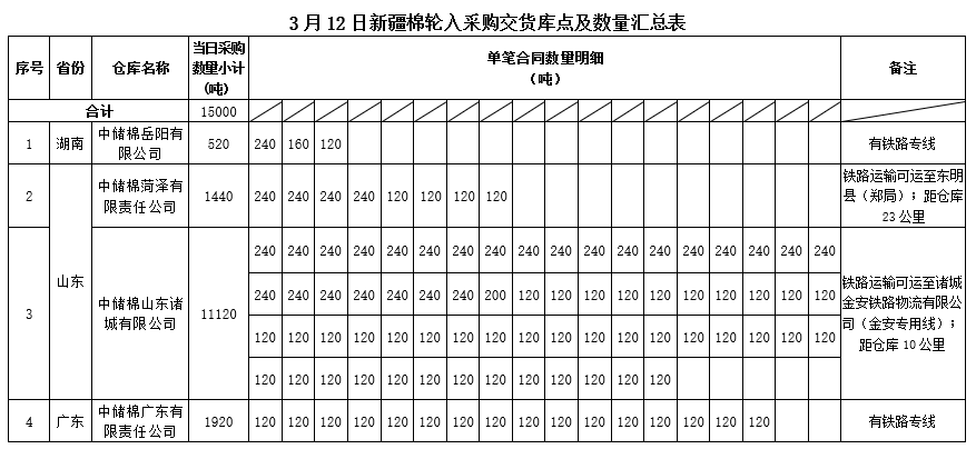 中國儲備棉管理有限公司定于2020年3月12日采購新疆棉15000噸(公定重量),最高限價13144元/噸(折標(biāo)準(zhǔn)級3128B價格)。具體庫點及數(shù)量如下: