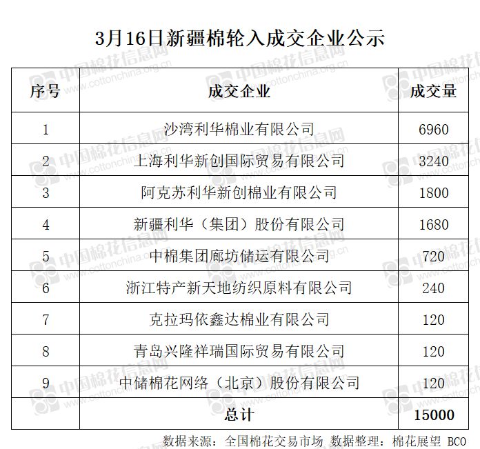 3月16日,中國(guó)儲(chǔ)備棉管理有限公司計(jì)劃采購(gòu)新疆棉15000噸,實(shí)際成交15000噸,成交率100%,成交均價(jià)12900元/噸。 其中內(nèi)地庫(kù)成交15000噸。