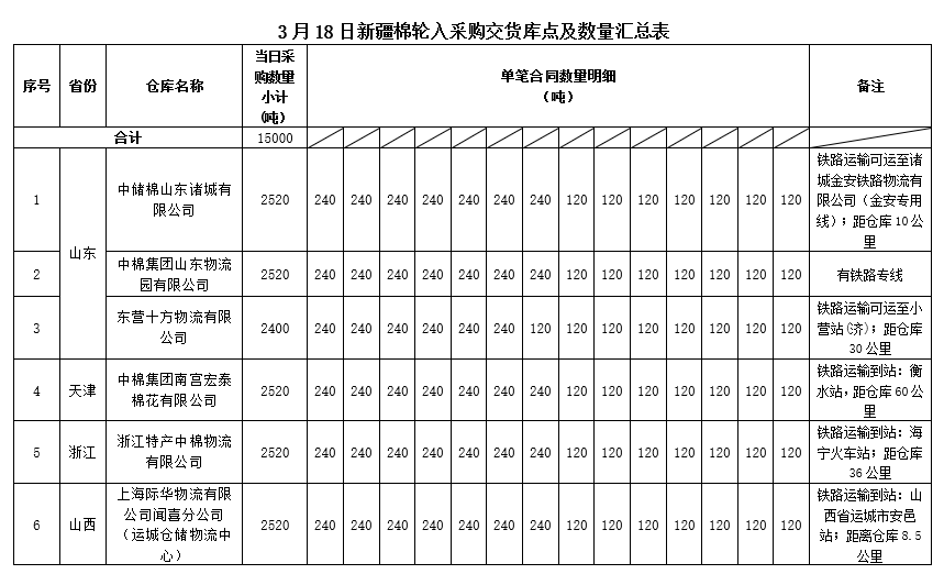 中國儲備棉管理有限公司定于2020年3月18日采購新疆棉15000噸(公定重量),最高限價12901元/噸(折標(biāo)準(zhǔn)級3128B價格)。具體庫點及數(shù)量如下: