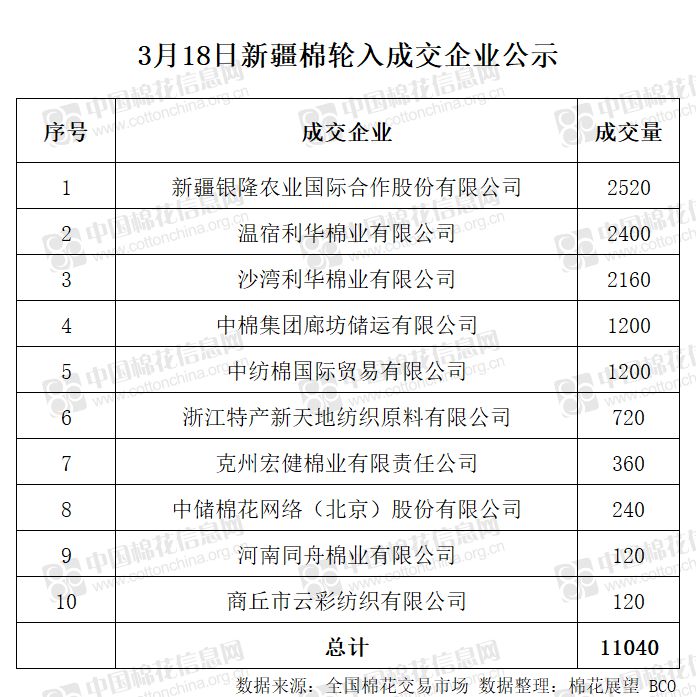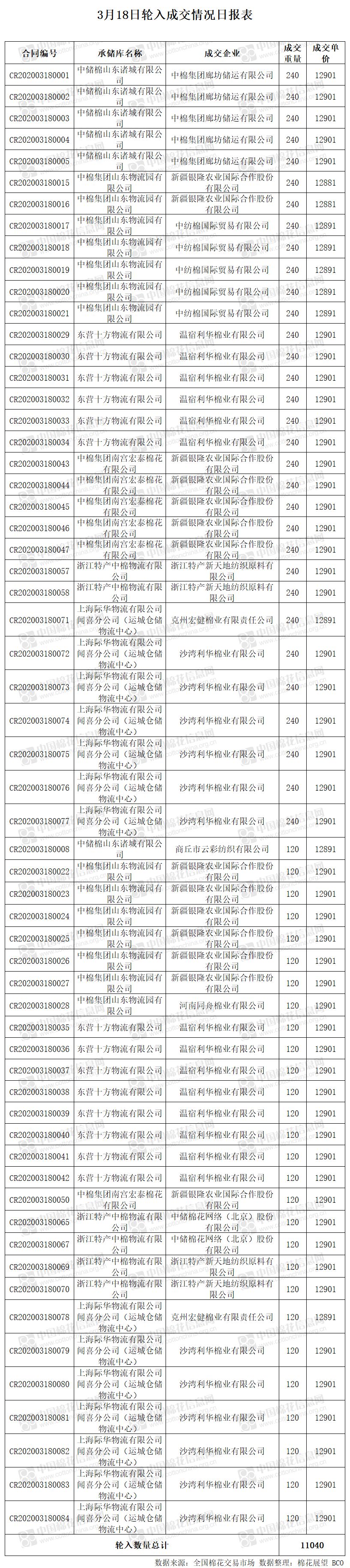 3月18日,中國儲備棉管理有限公司計劃采購新疆棉15000噸,實際成交11040噸,成交率73.6%,成交均價12899元/噸。 其中內(nèi)地庫成交11040噸。