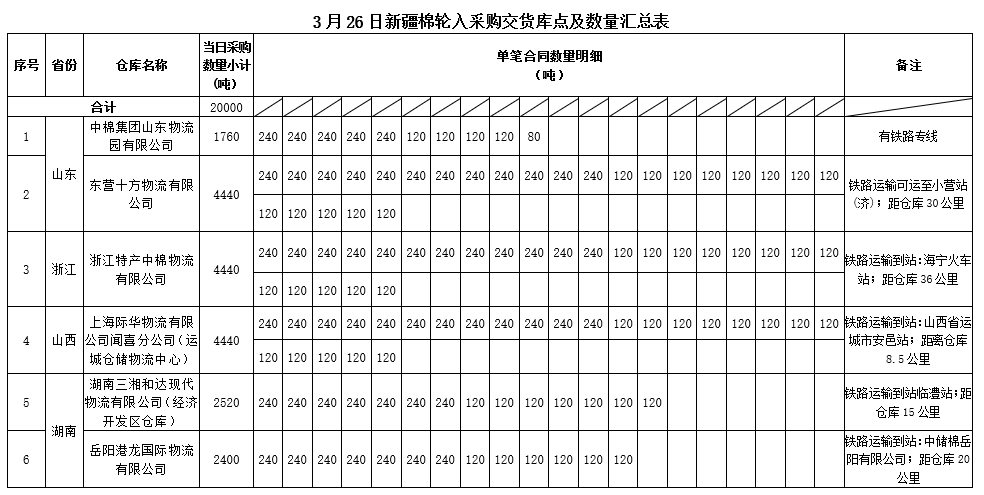 中國儲備棉管理有限公司定于2020年3月26日采購新疆棉20000噸(公定重量),最高限價12450元/噸(折標(biāo)準(zhǔn)級3128B價格)。具體庫點及數(shù)量如下: