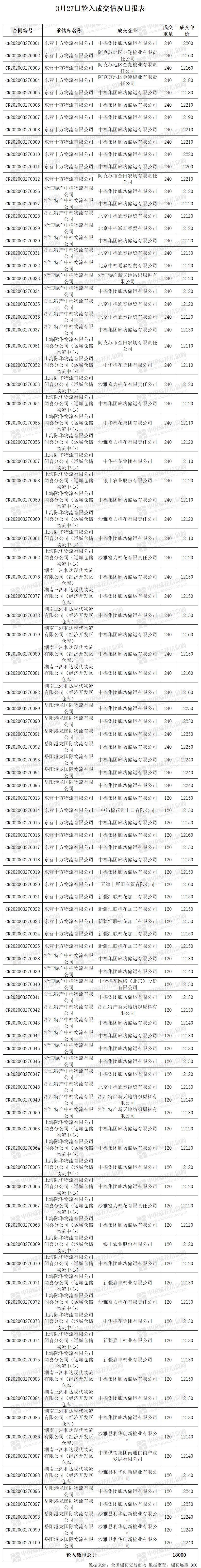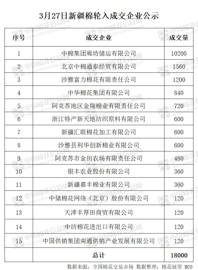 3月27日,中國(guó)儲(chǔ)備棉管理有限公司計(jì)劃采購(gòu)新疆棉18000噸,實(shí)際成交18000噸,成交率100%,成交均價(jià)12155元/噸。 其中內(nèi)地庫(kù)成交18000噸。