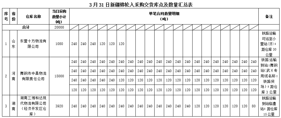 中國儲備棉管理有限公司定于2020年3月31日采購新疆棉20000噸(公定重量),最高限價11550元/噸(折標準級3128B價格)。具體庫點及數(shù)量如下:
