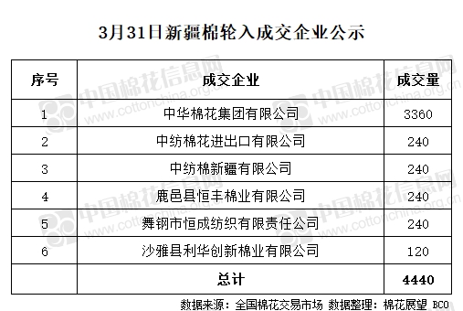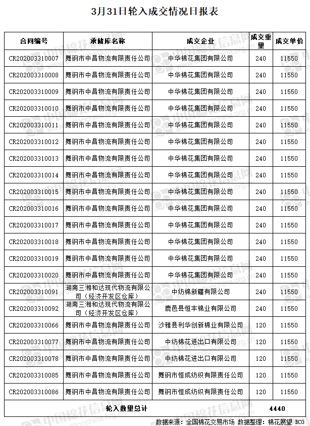 3月31日,中國儲備棉管理有限公司計劃采購新疆棉20000噸,實際成交4440噸,成交率22.2%,成交均價11550元/噸。 其中內(nèi)地庫成交4440噸。